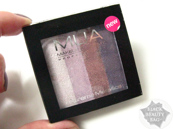 Skusiłam się tylko na poczwórną, metaliczną paletkę cieni MUA Extreme Metallics. Wybrałam ją, bo spodobały mi się dwa środkowe kolory. Bardzo oryginalne i ładnie się mienią.Na stronie producenta nie są dostępne, więc pochodzą pewnie z jakiejś starej kolekcji. Zapłaciłam 10 zł i jestem zadowolona. Były jeszcze inne wersje kolorystyczne.